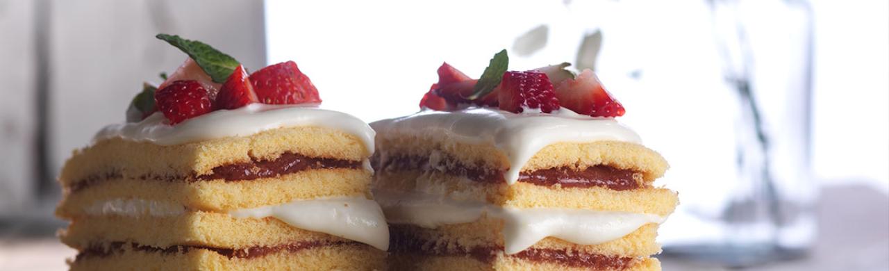 Cocinar en horno mediano por espacio de 5 minutos. Desmoldar caliente. Dejar enfriar y cortar en 6 cuadrados del mismo tamaño. Armar el milhojas intercalando la mermelada y el queso crema, decorar con frutillas frescas y menta. Cortar en porciones pequeñas y servir.