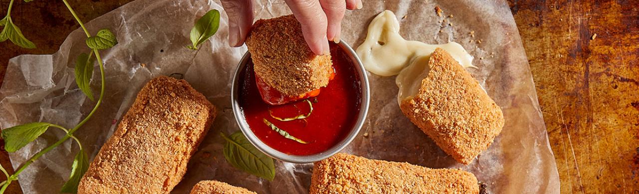 Cortar la mozzarella en bastones. Tomar una rebanada de pan y cortarla a la mitad, disponer por encima un bastón de mozzarella y tapar con la otra mitad presionando suave pero firmemente. Repetir esta operación con el resto de las rebanadas. Reservar.