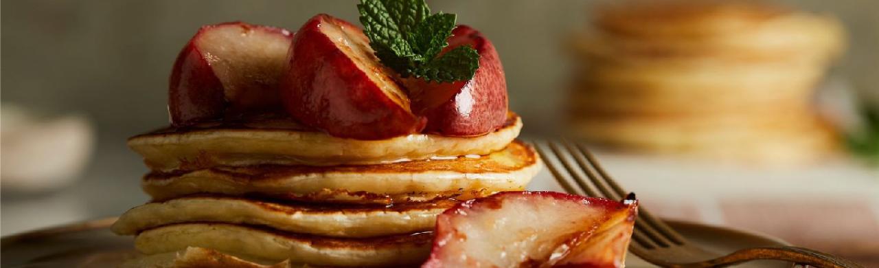 Hoy te traemos un desayuno de campeones: Pancakes de peras caramelizadas súper ricos. ¡Lo mejor de todo es que podés combinarlos con las frutas que más te gusten!