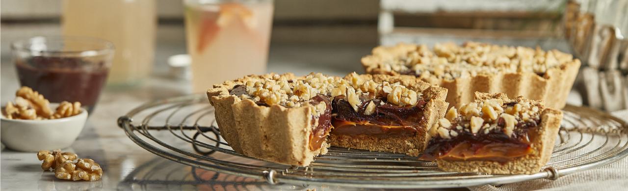 Una vez frías rellenar las tarteletas con el dulce de leche, cubrirlas con el chocolate y cuando esté tibio decorarlas con las nueces picadas.
