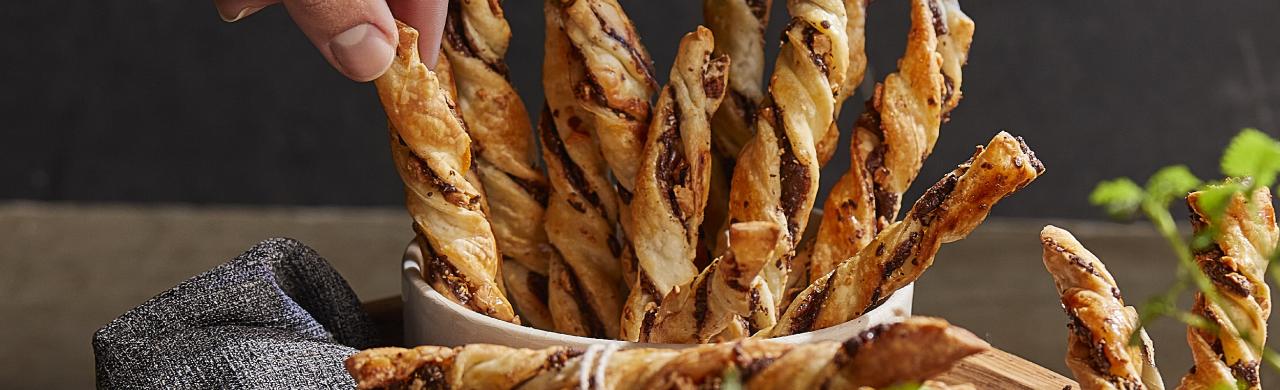 Derretir a baño María el chocolate cortado en trocitos, junto al Aceite Puro de Girasol Natura. Mientras tanto, picar los frutos secos. Extender un disco de masa, distribuir el chocolate derretido y los frutos secos picados. Cubrir con el otro disco de masa, dividir el disco por la mitad y cortar bastones de aproximadamente 1 cm. de ancho. Tomar los extremos y comenzar a enroscar formando los tirabuzones. Disponerlos sobre una placa lubricada con Rocío Vegetal Natura, pincelar con el huevo batido y cocinar en horno precalentado hasta dorar.